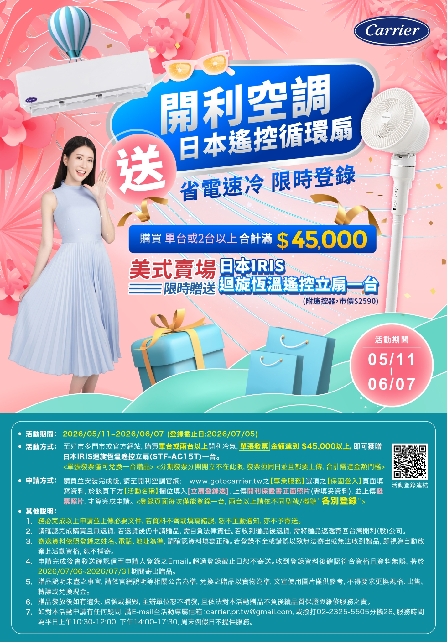 安裝完成後,到"保固登入"頁面完成活動登錄,再加碼贈送日本IRIS螺旋噴射恆溫立扇1台!!(市價$2590)